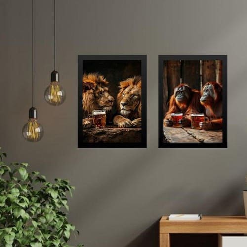 Kit 2 quadros divertidos para bar - animais 33x24cm - com vidro Moldura: madeira preta Informações do produto tire todas as suas dúvidas no descritivo abaixo: decoração para quarto, sala, cozinha, escritório, área gourmet e muito mais. Chega de paredes vazias medidas - cada peça tem 33x24cm a4 . Material do papel - papel fotográfico brilhante de altíssima resolução acabamento - todos os quadros são acompanhados de vidro para proteção da imagem. - moldura em madeira maciça na cor preta ou branca conforme produto escolhido e pendurador . - os quadros são embalados de forma segura com plástico bolha com camada dupla de acordo com o tamanho dos quadros. Garantia - garantia de 3 meses. Meu quadro chegou. Como posso fixá-lo Você precisa apenas de um martelo e um prego, pois os quadros já vão acompanhados de penduradores. Esta é a forma mais indicada. Como posso limpar meu quadro A limpeza é feita como um móvel comum da sua casa. Apenas um pano seco ou espanador são suficientes para tal