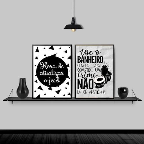 Kit 2 quadros divertidos para banheiro 33x24cm - com vidro Moldura: madeira preta Informações do produto Decoração para quarto, sala, cozinha, escritório, área gourmet e muito mais. Chega de paredes vazias Medidas - cada peça tem 33x24cm a4 . Material do papel - papel fotográfico brilhante de altíssima resolução Acabamento - todos os quadros são acompanhados de vidro para proteção da imagem. - Moldura em madeira maciça na cor preta e pendurador . - Os quadros são embalados de forma segura com plástico bolha com camada dupla de acordo com o tamanho dos quadros. - de 3 meses. Meu quadro chegou. Como posso fixá-lo Você precisa apenas de um martelo e um prego, pois os quadros já vão acompanhados de penduradores. Esta é a forma mais indicada. Como posso limpar meu quadro A limpeza é feita como um móvel comum da sua casa. Apenas um pano seco ou espanador são suficientes para tal Ean: 7895142255844