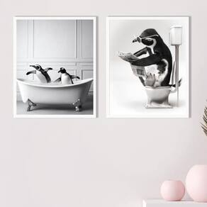 Kit 2 quadros divertidos para banheiro - pinguins 24x18cm Moldura: madeira branca Informações do produto tire todas as suas dúvidas no descritivo abaixo: decoração para quarto, sala, cozinha, escritório, área gourmet e muito mais. Chega de paredes vazias medidas - cada peça tem 24x18cm a5 . Material do papel - papel fotográfico brilhante de altíssima resolução acabamento - todos os quadros são acompanhados de uma película de acetato para proteção da imagem. - os quadros são embalados de forma segura com plástico bolha com camada dupla de acordo com o tamanho dos quadros. Garantia - garantia de 3 meses. Meu quadro chegou. Como posso fixá-lo Você precisa apenas de um martelo e um prego, pois os quadros já vão acompanhados de penduradores. Esta é a forma mais indicada. Caso prefira, você pode utilizar uma fita dupla face neste caso, sugerimos de alta qualidade para evitar que descole e seu quadro caia . Como posso limpar meu quadro A limpeza é feita como um móvel comum da sua casa. Apenas um pano seco ou espanador são suficientes para tal Ean: 7892944094923
