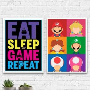 Kit 2 quadros eat sleep game repeat personagens 24x18cm - com vidro Moldura: madeira branca Informações do produto tire todas as suas dúvidas no descritivo abaixo: decoração para quarto, sala, cozinha, escritório, área gourmet e muito mais. Chega de paredes vazias medidas - cada peça tem 24x18cm a5 . Material do papel - papel fotográfico brilhante de altíssima resolução acabamento - todos os quadros são acompanhados de vidro para proteção da imagem. - moldura em madeira maciça na cor preta e pendurador . - os quadros são embalados de forma segura com plástico bolha com camada dupla de acordo com o tamanho dos quadros. Garantia - garantia de 3 meses. Meu quadro chegou. Como posso fixá-lo Você precisa apenas de um martelo e um prego, pois os quadros já vão acompanhados de penduradores. Esta é a forma mais indicada. Como posso limpar meu quadro A limpeza é feita como um móvel comum da sua casa. Apenas um pano seco ou espanador são suficientes para tal