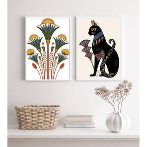Kit 2 Quadros Egípcios Gato Bastet E Flor De Lotus 33X24Cm