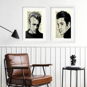 Kit 2 quadros elvis e james dean - 60x48cm Moldura: madeira branca Informações do produto tire todas as suas dúvidas no descritivo abaixo: decoração para quarto, sala, cozinha, escritório, área gourmet e muito mais. Chega de paredes vazias medidas - cada peça tem 60x48cm . Material do papel - papel fotográfico brilhante de altíssima resolução acabamento - todos os quadros são acompanhados de vidro para proteção da imagem. - moldura em madeira maciça na cor preta ou branca conforme produto escolhido e pendurador. - paspatur branco com 7cm de largura - os quadros são embalados de forma segura com plástico bolha com camada dupla de acordo com o tamanho dos quadros. Garantia - garantia de 3 meses. Meu quadro chegou. Como posso fixá-lo Você precisa apenas de um martelo e um prego, pois os quadros já vão acompanhados de penduradores. Esta é a forma mais indicada. Como posso limpar meu quadro A limpeza é feita como um móvel comum da sua casa. Apenas um pano seco ou espanador são suficientes para tal