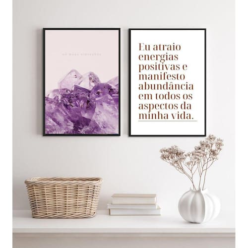 Kit 2 quadros energias positivas- cristais abundância 45x34cm Moldura: madeira preta Informações do produto tire todas as suas dúvidas no descritivo abaixo: decoração para quarto, sala, cozinha, escritório, área gourmet e muito mais. Chega de paredes vazias. Medidas - cada peça tem 45x34cm a3 . Material do papel - papel fotográfico brilhante de altíssima resolução acabamento - todos os quadros são acompanhados de uma película de acetato para proteção da imagem. - os quadros são embalados de forma segura com plástico bolha com camada dupla de acordo com o tamanho dos quadros. Garantia - garantia de 3 meses. Meu quadro chegou. Como posso fixá-lo Você precisa apenas de um martelo e um prego, pois os quadros já vão acompanhados de penduradores. Esta é a forma mais indicada. Caso prefira, você pode utilizar uma fita dupla face neste caso, sugerimos de alta qualidade para evitar que descole e seu quadro caia . Como posso limpar meu quadro A limpeza é feita como um móvel comum da sua casa. Apenas um pano seco ou espanador são suficientes para tal Ean: 7893784535119