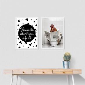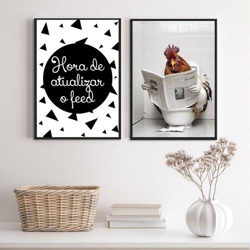 Kit 2 quadros engraçados banheiro - galo 24x18cm - com vidro Moldura: madeira preta Informações do produto tire todas as suas dúvidas no descritivo abaixo: decoração para quarto, sala, cozinha, escritório, área gourmet e muito mais. Chega de paredes vazias medidas - cada peça tem 24x18cm a5 . Material do papel - papel fotográfico brilhante de altíssima resolução acabamento - todos os quadros são acompanhados de vidro para proteção da imagem. - moldura em madeira maciça na cor preta ou branca conforme produto escolhido e pendurador . - os quadros são embalados de forma segura com plástico bolha com camada dupla de acordo com o tamanho dos quadros. Garantia - garantia de 3 meses. Meu quadro chegou. Como posso fixá-lo Você precisa apenas de um martelo e um prego, pois os quadros já vão acompanhados de penduradores. Esta é a forma mais indicada. Como posso limpar meu quadro A limpeza é feita como um móvel comum da sua casa. Apenas um pano seco ou espanador são suficientes para tal