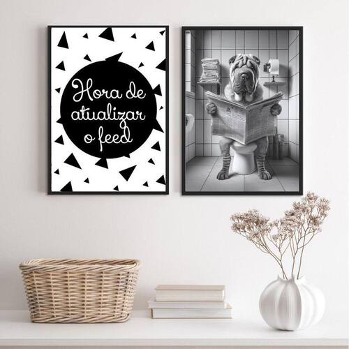 Kit 2 quadros engraçados banheiro - sharpeei 33x24cm - com vidro Moldura: madeira branca Informações do produto tire todas as suas dúvidas no descritivo abaixo: decoração para quarto, sala, cozinha, escritório, área gourmet e muito mais. Chega de paredes vazias medidas - cada peça tem 33x24cm a4 . Material do papel - papel fotográfico brilhante de altíssima resolução acabamento - todos os quadros são acompanhados de vidro para proteção da imagem. - moldura em madeira maciça na cor preta ou branca conforme produto escolhido e pendurador . - os quadros são embalados de forma segura com plástico bolha com camada dupla de acordo com o tamanho dos quadros. Garantia - garantia de 3 meses. Meu quadro chegou. Como posso fixá-lo Você precisa apenas de um martelo e um prego, pois os quadros já vão acompanhados de penduradores. Esta é a forma mais indicada. Como posso limpar meu quadro A limpeza é feita como um móvel comum da sua casa. Apenas um pano seco ou espanador são suficientes para tal