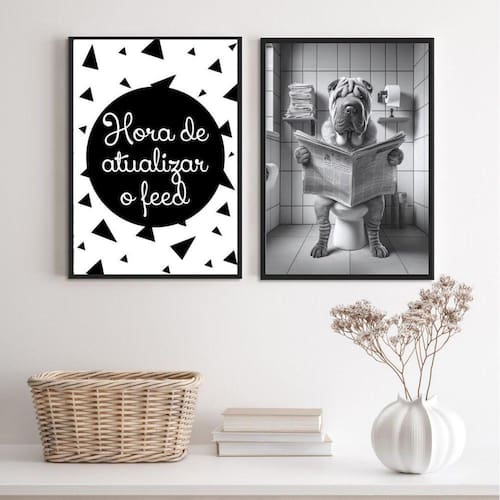 Kit 2 quadros engraçados banheiro - sharpeei 33x24cm Moldura: madeira preta Informações do produto tire todas as suas dúvidas no descritivo abaixo: decoração para quarto, sala, cozinha, escritório, área gourmet e muito mais. Chega de paredes vazias medidas - cada peça tem 33x24cm a4 . Material do papel - papel fotográfico brilhante de altíssima resolução acabamento - todos os quadros são acompanhados de uma película de acetato para proteção da imagem. - os quadros são embalados de forma segura com plástico bolha com camada dupla de acordo com o tamanho dos quadros. Garantia - garantia de 3 meses. Meu quadro chegou. Como posso fixá-lo Você precisa apenas de um martelo e um prego, pois os quadros já vão acompanhados de penduradores. Esta é a forma mais indicada. Caso prefira, você pode utilizar uma fita dupla face neste caso, sugerimos de alta qualidade para evitar que descole e seu quadro caia . Como posso limpar meu quadro A limpeza é feita como um móvel comum da sua casa. Apenas um pano seco ou espanador são suficientes para tal