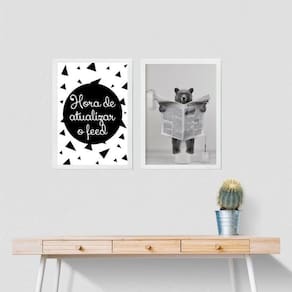 Kit 2 quadros engraçados banheiro - urso 24x18cm Moldura: madeira preta Informações do produto tire todas as suas dúvidas no descritivo abaixo: decoração para quarto, sala, cozinha, escritório, área gourmet e muito mais. Chega de paredes vazias medidas - cada peça tem 24x18cm a5 . Material do papel - papel fotográfico brilhante de altíssima resolução acabamento - todos os quadros são acompanhados de uma película de acetato para proteção da imagem. - os quadros são embalados de forma segura com plástico bolha com camada dupla de acordo com o tamanho dos quadros. Garantia - garantia de 3 meses. Meu quadro chegou. Como posso fixá-lo Você precisa apenas de um martelo e um prego, pois os quadros já vão acompanhados de penduradores. Esta é a forma mais indicada. Caso prefira, você pode utilizar uma fita dupla face neste caso, sugerimos de alta qualidade para evitar que descole e seu quadro caia . Como posso limpar meu quadro A limpeza é feita como um móvel comum da sua casa. Apenas um pano seco ou espanador são suficientes para tal