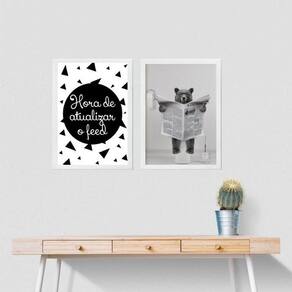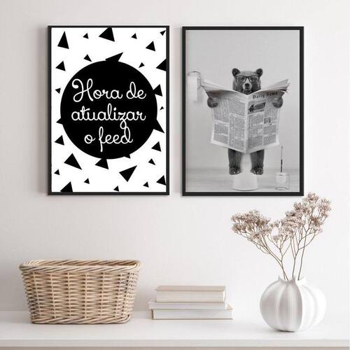 Kit 2 quadros engraçados banheiro - urso 45x34cm Moldura: madeira preta Informações do produto tire todas as suas dúvidas no descritivo abaixo: decoração para quarto, sala, cozinha, escritório, área gourmet e muito mais. Chega de paredes vazias. Medidas - cada peça tem 45x34cm a3 . Material do papel - papel fotográfico brilhante de altíssima resolução acabamento - todos os quadros são acompanhados de uma película de acetato para proteção da imagem. - os quadros são embalados de forma segura com plástico bolha com camada dupla de acordo com o tamanho dos quadros. Garantia - garantia de 3 meses. Meu quadro chegou. Como posso fixá-lo Você precisa apenas de um martelo e um prego, pois os quadros já vão acompanhados de penduradores. Esta é a forma mais indicada. Caso prefira, você pode utilizar uma fita dupla face neste caso, sugerimos de alta qualidade para evitar que descole e seu quadro caia . Como posso limpar meu quadro A limpeza é feita como um móvel comum da sua casa. Apenas um pano seco ou espanador são suficientes para tal