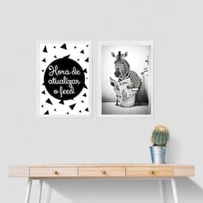 Kit 2 quadros engraçados banheiro - zebra 45x34cm Moldura: madeira branca Informações do produto tire todas as suas dúvidas no descritivo abaixo: decoração para quarto, sala, cozinha, escritório, área gourmet e muito mais. Chega de paredes vazias. Medidas - cada peça tem 45x34cm a3 . Material do papel - papel fotográfico brilhante de altíssima resolução acabamento - todos os quadros são acompanhados de uma película de acetato para proteção da imagem. - os quadros são embalados de forma segura com plástico bolha com camada dupla de acordo com o tamanho dos quadros. Garantia - garantia de 3 meses. Meu quadro chegou. Como posso fixá-lo Você precisa apenas de um martelo e um prego, pois os quadros já vão acompanhados de penduradores. Esta é a forma mais indicada. Caso prefira, você pode utilizar uma fita dupla face neste caso, sugerimos de alta qualidade para evitar que descole e seu quadro caia . Como posso limpar meu quadro A limpeza é feita como um móvel comum da sua casa. Apenas um pano seco ou espanador são suficientes para tal