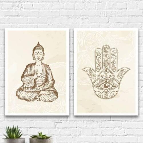 Kit 2 Quadros Esotéricos Buda E Hamsa 33X24Cm - Branca