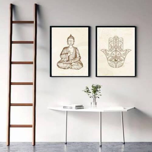 Kit 2 Quadros Esotéricos Buda E Hamsa 33X24Cm - Preta