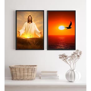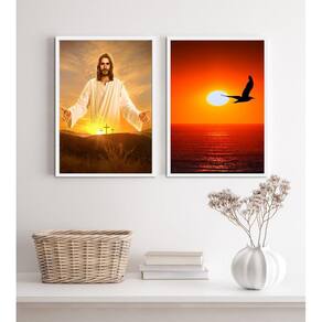 Kit 2 quadros evangélicos jesus por do sol 45x34cm Moldura: madeira branca Informações do produto tire todas as suas dúvidas no descritivo abaixo: decoração para quarto, sala, cozinha, escritório, área gourmet e muito mais. Chega de paredes vazias. Medidas - cada peça tem 45x34cm a3 . Material do papel - papel fotográfico brilhante de altíssima resolução acabamento - todos os quadros são acompanhados de uma película de acetato para proteção da imagem. - os quadros são embalados de forma segura com plástico bolha com camada dupla de acordo com o tamanho dos quadros. Garantia - garantia de 3 meses. Meu quadro chegou. Como posso fixá-lo Você precisa apenas de um martelo e um prego, pois os quadros já vão acompanhados de penduradores. Esta é a forma mais indicada. Caso prefira, você pode utilizar uma fita dupla face neste caso, sugerimos de alta qualidade para evitar que descole e seu quadro caia . Como posso limpar meu quadro A limpeza é feita como um móvel comum da sua casa. Apenas um pano seco ou espanador são suficientes para tal Ean: 7891910607853