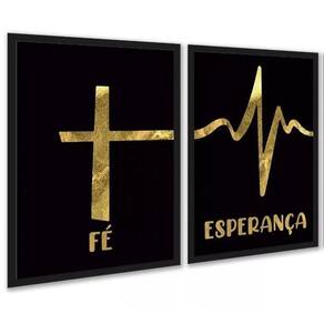 Kit 2 quadros fé esperança - preto com dourado 33x24cm - com vidro Cor: moldura preta Informações do produto tire todas as suas dúvidas no descritivo abaixo: decoração para quarto, sala, cozinha, escritório, área gourmet e muito mais. Chega de paredes vazias medidas - cada peça tem 33x24cm a4 . Material do papel - papel fotográfico brilhante de altíssima resolução acabamento - todos os quadros são acompanhados de vidro para proteção da imagem. - moldura em madeira maciça na cor preta ou branca conforme produto escolhido e pendurador . - os quadros são embalados de forma segura com plástico bolha com camada dupla de acordo com o tamanho dos quadros. - de 3 meses. Meu quadro chegou. Como posso fixá-lo Você precisa apenas de um martelo e um prego, pois os quadros já vão acompanhados de penduradores. Esta é a forma mais indicada. Como posso limpar meu quadro A limpeza é feita como um móvel comum da sua casa. Apenas um pano seco ou espanador são suficientes para tal