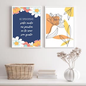 Especificações técnicas: - Título: Kit 2 Quadros Florais Hooponopono 24X18Cm - Medidas: cada peça tem 24x18cm tamanho A5 - Moldura: madeira branca - Material do papel: papel fotográfico brilhante de altíssima resolução - Acabamento: película de acetato para proteção da imagem - Embalagem: plástico bolha com camada dupla - Fixação: acompanha penduradores, pode ser utilizado martelo e prego ou fita dupla face de alta qualidade - Limpeza: utilizar pano seco ou espanador Ean: 7897618161994