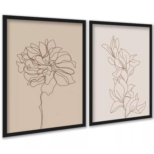 Kit 2 Quadros Flores Linhas Suaves - Bege 45X34Cm - Vidro