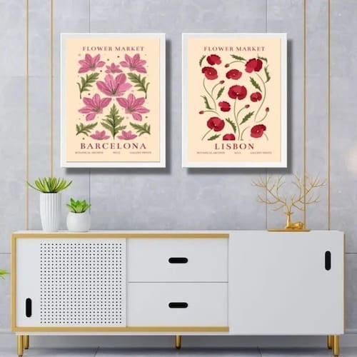 Kit 2 quadros flower market - lisboa e barcelona 33x24cm - com vidro Cor: moldura branca Informações do produto tire todas as suas dúvidas no descritivo abaixo: decoração para quarto, sala, cozinha, escritório, área gourmet e muito mais. Chega de paredes vazias medidas - cada peça tem 33x24cm a4 . Material do papel - papel fotográfico brilhante de altíssima resolução acabamento - todos os quadros são acompanhados de vidro para proteção da imagem. - moldura em madeira maciça na cor preta ou branca conforme produto escolhido e pendurador . - os quadros são embalados de forma segura com plástico bolha com camada dupla de acordo com o tamanho dos quadros. Garantia - garantia de 3 meses. Meu quadro chegou. Como posso fixá-lo Você precisa apenas de um martelo e um prego, pois os quadros já vão acompanhados de penduradores. Esta é a forma mais indicada. Como posso limpar meu quadro A limpeza é feita como um móvel comum da sua casa. Apenas um pano seco ou espanador são suficientes para tal