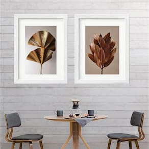 Kit 2 quadros folhagem bronze - 60x48cm Moldura: madeira preta Informações do produto tire todas as suas dúvidas no descritivo abaixo: decoração para quarto, sala, cozinha, escritório, área gourmet e muito mais. Chega de paredes vazias medidas - cada peça tem 60x48cm . Material do papel - papel fotográfico brilhante de altíssima resolução acabamento - todos os quadros são acompanhados de vidro para proteção da imagem. - moldura em madeira maciça na cor preta ou branca conforme produto escolhido e pendurador. - paspatur branco com 7cm de largura - os quadros são embalados de forma segura com plástico bolha com camada dupla de acordo com o tamanho dos quadros. Garantia - garantia de 3 meses. Meu quadro chegou. Como posso fixá-lo Você precisa apenas de um martelo e um prego, pois os quadros já vão acompanhados de penduradores. Esta é a forma mais indicada. Como posso limpar meu quadro A limpeza é feita como um móvel comum da sua casa. Apenas um pano seco ou espanador são suficientes para tal