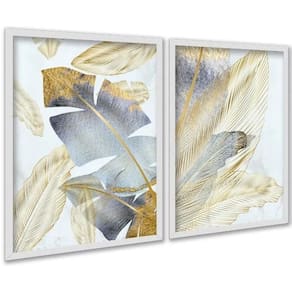 Kit 2 Quadros Folhas Bananeiras Cinza E Dourado 45X34Cm