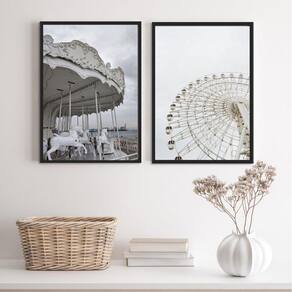 Kit 2 quadros fotografias brancas carrossel e roda gigante 33x24cm Moldura: madeira preta Informações do produto tire todas as suas dúvidas no descritivo abaixo: decoração para quarto, sala, cozinha, escritório, área gourmet e muito mais. Chega de paredes vazias medidas - cada peça tem 33x24cm a4 . Material do papel - papel fotográfico brilhante de altíssima resolução acabamento - todos os quadros são acompanhados de uma película de acetato para proteção da imagem. - os quadros são embalados de forma segura com plástico bolha com camada dupla de acordo com o tamanho dos quadros. Garantia - garantia de 3 meses. Meu quadro chegou. Como posso fixá-lo Você precisa apenas de um martelo e um prego, pois os quadros já vão acompanhados de penduradores. Esta é a forma mais indicada. Caso prefira, você pode utilizar uma fita dupla face neste caso, sugerimos de alta qualidade para evitar que descole e seu quadro caia . Como posso limpar meu quadro A limpeza é feita como um móvel comum da sua casa. Apenas um pano seco ou espanador são suficientes para tal Ean: 7892996258687