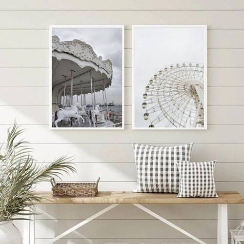 Kit 2 Quadros Fotografias Brancas Carrossel E Roda Gigante