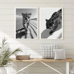 Kit 2 quadros fotos leopardos preto e branco 45x34cm - com vidro Cor: moldura preta Informações do produto tire todas as suas dúvidas no descritivo abaixo: decoração para quarto, sala, cozinha, escritório, área gourmet e muito mais. Chega de paredes vazias medidas - cada peça tem 45x34cm a3 . Material do papel - papel fotográfico brilhante de altíssima resolução acabamento - todos os quadros são acompanhados de vidro para proteção da imagem. - moldura em madeira maciça na cor preta ou branca conforme produto escolhido e pendurador . - os quadros são embalados de forma segura com plástico bolha com camada dupla de acordo com o tamanho dos quadros. Garantia - garantia de 3 meses. Meu quadro chegou. Como posso fixá-lo Você precisa apenas de um martelo e um prego, pois os quadros já vão acompanhados de penduradores. Esta é a forma mais indicada. Como posso limpar meu quadro A limpeza é feita como um móvel comum da sua casa. Apenas um pano seco ou espanador são suficientes para tal Ean: 7891234560773
