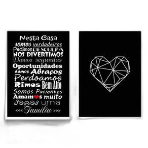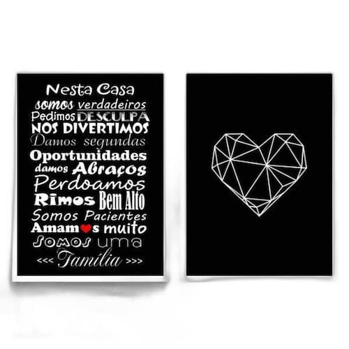 Kit 2 quadros frase família coração 33x24cm - com vidro Moldura: madeira preta Informações do produto tire todas as suas dúvidas no descritivo abaixo: decoração para quarto, sala, cozinha, escritório, área gourmet e muito mais. Chega de paredes vazias medidas - cada peça tem 33x24cm a4 . Material do papel - papel fotográfico brilhante de altíssima resolução acabamento - todos os quadros são acompanhados de vidro para proteção da imagem. - moldura em madeira maciça na cor preta e pendurador . - os quadros são embalados de forma segura com plástico bolha com camada dupla de acordo com o tamanho dos quadros. Garantia - garantia de 3 meses. Meu quadro chegou. Como posso fixá-lo Você precisa apenas de um martelo e um prego, pois os quadros já vão acompanhados de penduradores. Esta é a forma mais indicada. Como posso limpar meu quadro A limpeza é feita como um móvel comum da sua casa. Apenas um pano seco ou espanador são suficientes para tal