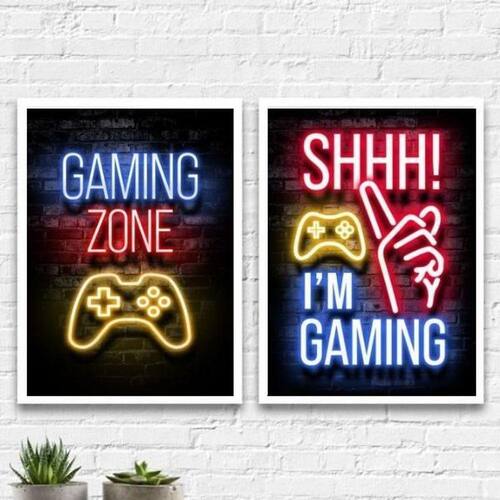 Kit 2 quadros gaming zone 24x18cm Moldura: madeira preta