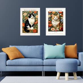 Kit 2 quadros gatos com flores - william morris 33x24cm - com vidro Cor: moldura preta Informações do produto tire todas as suas dúvidas no descritivo abaixo: decoração para quarto, sala, cozinha, escritório, área gourmet e muito mais. Chega de paredes vazias medidas - cada peça tem 33x24cm a4 . Material do papel - papel fotográfico brilhante de altíssima resolução acabamento - todos os quadros são acompanhados de vidro para proteção da imagem. - moldura em madeira maciça na cor preta ou branca conforme produto escolhido e pendurador . - os quadros são embalados de forma segura com plástico bolha com camada dupla de acordo com o tamanho dos quadros. Garantia - garantia de 3 meses. Meu quadro chegou. Como posso fixá-lo Você precisa apenas de um martelo e um prego, pois os quadros já vão acompanhados de penduradores. Esta é a forma mais indicada. Como posso limpar meu quadro A limpeza é feita como um móvel comum da sua casa. Apenas um pano seco ou espanador são suficientes para tal