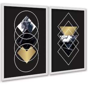 Kit 2 quadros geométricos preto dourado mármore 33x24cm Cor: moldura branca Informações do produto tire todas as suas dúvidas no descritivo abaixo: decoração para quarto, sala, cozinha, escritório, área gourmet e muito mais. Chega de paredes vazias medidas - cada peça tem 33x24cm a4 . Material do papel - papel fotográfico brilhante de altíssima resolução acabamento - todos os quadros são acompanhados de uma película de acetato para proteção da imagem. - os quadros são embalados de forma segura com plástico bolha com camada dupla de acordo com o tamanho dos quadros. - de 3 meses. Meu quadro chegou. Como posso fixá-lo Você precisa apenas de um martelo e um prego, pois os quadros já vão acompanhados de penduradores. Esta é a forma mais indicada. Caso prefira, você pode utilizar uma fita dupla face neste caso, sugerimos de alta qualidade para evitar que descole e seu quadro caia . Como posso limpar meu quadro A limpeza é feita como um móvel comum da sua casa. Apenas um pano seco ou espanador são suficientes para tal