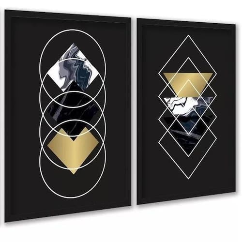 Kit 2 quadros geométricos preto dourado mármore 33x24cm - com vidro Cor: moldura branca Informações do produto tire todas as suas dúvidas no descritivo abaixo: decoração para quarto, sala, cozinha, escritório, área gourmet e muito mais. Chega de paredes vazias medidas - cada peça tem 33x24cm a4 . Material do papel - papel fotográfico brilhante de altíssima resolução acabamento - todos os quadros são acompanhados de vidro para proteção da imagem. - moldura em madeira maciça na cor preta ou branca conforme produto escolhido e pendurador . - os quadros são embalados de forma segura com plástico bolha com camada dupla de acordo com o tamanho dos quadros. - de 3 meses. Meu quadro chegou. Como posso fixá-lo Você precisa apenas de um martelo e um prego, pois os quadros já vão acompanhados de penduradores. Esta é a forma mais indicada. Como posso limpar meu quadro A limpeza é feita como um móvel comum da sua casa. Apenas um pano seco ou espanador são suficientes para tal