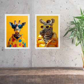 Kit 2 Quadros Girafa e Zebra Fashion De Óculos 45x34cm - com vidro - Cor: Moldura branca