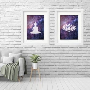 Kit 2 quadros grandes buda galáxia - 60x48cm Moldura: madeira branca Informações do produto tire todas as suas dúvidas no descritivo abaixo: decoração para quarto, sala, cozinha, escritório, área gourmet e muito mais. Chega de paredes vazias medidas - cada peça tem 60x48cm . Material do papel - papel fotográfico brilhante de altíssima resolução acabamento - todos os quadros são acompanhados de vidro para proteção da imagem. - moldura em madeira maciça na cor preta ou branca conforme produto escolhido e pendurador. - paspatur branco com 7cm de largura - os quadros são embalados de forma segura com plástico bolha com camada dupla de acordo com o tamanho dos quadros. Garantia - garantia de 3 meses. Meu quadro chegou. Como posso fixá-lo Você precisa apenas de um martelo e um prego, pois os quadros já vão acompanhados de penduradores. Esta é a forma mais indicada. Como posso limpar meu quadro A limpeza é feita como um móvel comum da sua casa. Apenas um pano seco ou espanador são suficientes para tal