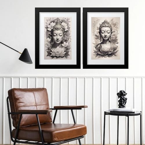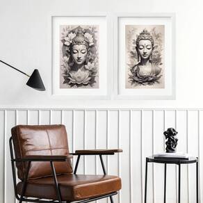 Kit 2 quadros grandes budas cinza - 60x48cm Moldura: madeira preta Informações do produto tire todas as suas dúvidas no descritivo abaixo: decoração para quarto, sala, cozinha, escritório, área gourmet e muito mais. Chega de paredes vazias medidas - cada peça tem 60x48cm . Material do papel - papel fotográfico brilhante de altíssima resolução acabamento - todos os quadros são acompanhados de vidro para proteção da imagem. - moldura em madeira maciça na cor preta ou branca conforme produto escolhido e pendurador. - paspatur branco com 7cm de largura - os quadros são embalados de forma segura com plástico bolha com camada dupla de acordo com o tamanho dos quadros. Garantia - garantia de 3 meses. Meu quadro chegou. Como posso fixá-lo Você precisa apenas de um martelo e um prego, pois os quadros já vão acompanhados de penduradores. Esta é a forma mais indicada. Como posso limpar meu quadro A limpeza é feita como um móvel comum da sua casa. Apenas um pano seco ou espanador são suficientes para tal
