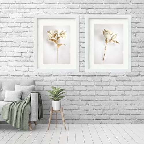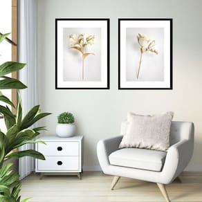 Kit 2 Quadros Grandes Flores Branca Dourado - 60X48Cm