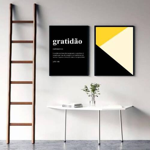 Kit 2 Quadros Gratidão Amarelo E Preto 24X18Cm Moldura: madeira preta Informações do produto: decoração para quarto, sala, cozinha, escritório, área gourmet e muito mais. Chega de paredes vazias Medidas - cada peça tem 24x18cm a5 . Material do papel - papel fotográfico brilhante de altíssima resolução acabamento - todos os quadros são acompanhados de uma película de acetato para proteção da imagem. - moldura em madeira maciça na cor preta e pendurador móvel que pode ser retirado facilmente caso deseje fixar com fita dupla face. - os quadros são embalados de forma segura com plástico bolha com camada dupla de acordo com o tamanho dos quadros. - de 3 meses Meu quadro chegou. Como posso fixá-lo Você precisa apenas de um martelo e um prego, pois os quadros já vão acompanhados de penduradores. Esta é a forma mais indicada. Caso prefira, você pode utilizar uma fita dupla face neste caso, sugerimos de alta qualidade para evitar que descole e seu quadro caia . Como posso limpar meu quadro A limpeza é feita como um móvel comum da sua casa. Apenas um pano seco ou espanador são suficientes para tal Ean: 7892091102120