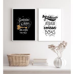 Kit 2 quadros gratidão e agradecer- a chave do sucesso 24x18cm - com vidro Moldura: madeira branca Informações do produto tire todas as suas dúvidas no descritivo abaixo: decoração para quarto, sala, cozinha, escritório, área gourmet e muito mais. Chega de paredes vazias medidas - cada peça tem 24x18cm a5 . Material do papel - papel fotográfico brilhante de altíssima resolução acabamento - todos os quadros são acompanhados de vidro para proteção da imagem. - moldura em madeira maciça na cor preta ou branca conforme produto escolhido e pendurador . - os quadros são embalados de forma segura com plástico bolha com camada dupla de acordo com o tamanho dos quadros. Garantia - garantia de 3 meses. Meu quadro chegou. Como posso fixá-lo Você precisa apenas de um martelo e um prego, pois os quadros já vão acompanhados de penduradores. Esta é a forma mais indicada. Como posso limpar meu quadro A limpeza é feita como um móvel comum da sua casa. Apenas um pano seco ou espanador são suficientes para tal Ean: 7890317833438