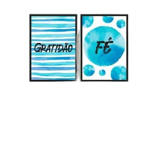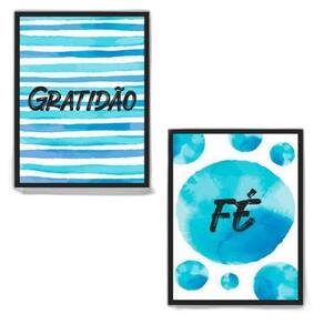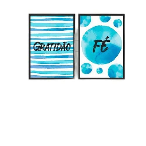 Kit 2 quadros gratidão e fé azul 24x18cm - com vidro Moldura: madeira branca Informações do produto tire todas as suas dúvidas no descritivo abaixo: decoração para quarto, sala, cozinha, escritório, área gourmet e muito mais. Chega de paredes vazias medidas - cada peça tem 24x18cm a5 . Material do papel - papel fotográfico brilhante de altíssima resolução acabamento - todos os quadros são acompanhados de vidro para proteção da imagem. - moldura em madeira maciça na cor preta e pendurador . - os quadros são embalados de forma segura com plástico bolha com camada dupla de acordo com o tamanho dos quadros. - de 3 meses. Meu quadro chegou. Como posso fixá-lo Você precisa apenas de um martelo e um prego, pois os quadros já vão acompanhados de penduradores. Esta é a forma mais indicada. Como posso limpar meu quadro A limpeza é feita como um móvel comum da sua casa. Apenas um pano seco ou espanador são suficientes para tal Ean: 7895142262613