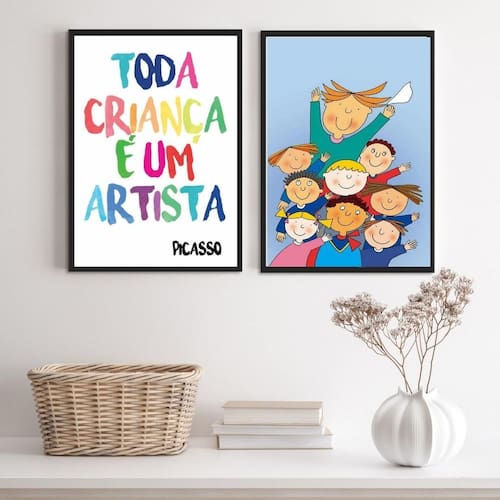 O Kit 2 Quadros Infantis Toda Criança É Um Artista 24x18cm é perfeito para decorar o quarto, sala, cozinha, escritório, área gourmet e muito mais. Com moldura de madeira preta, esse kit traz um toque especial para qualquer ambiente.