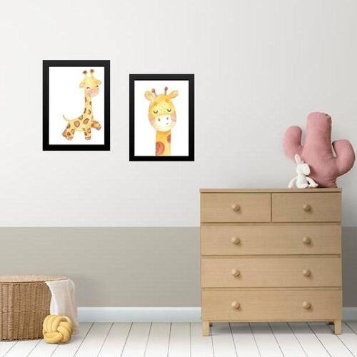 Kit 2 quadros infantis aquarela girafinha 24x18cm - com vidro Moldura: madeira branca Informações do produto tire todas as suas dúvidas no descritivo abaixo: decoração para quarto, sala, cozinha, escritório, área gourmet e muito mais. Chega de paredes vazias medidas - cada peça tem 24x18cm a5 . Material do papel - papel fotográfico brilhante de altíssima resolução acabamento - todos os quadros são acompanhados de vidro para proteção da imagem. - moldura em madeira maciça na cor preta ou branca conforme produto escolhido e pendurador . - os quadros são embalados de forma segura com plástico bolha com camada dupla de acordo com o tamanho dos quadros. Garantia - garantia de 3 meses. Meu quadro chegou. Como posso fixá-lo Você precisa apenas de um martelo e um prego, pois os quadros já vão acompanhados de penduradores. Esta é a forma mais indicada. Como posso limpar meu quadro A limpeza é feita como um móvel comum da sua casa. Apenas um pano seco ou espanador são suficientes para tal