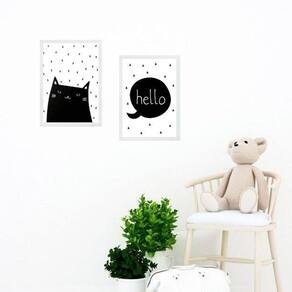 Kit 2 quadros infantis gatinho escandinavo 24x18cm - com vidro Moldura: madeira branca Informações do produto tire todas as suas dúvidas no descritivo abaixo: decoração para quarto, sala, cozinha, escritório, área gourmet e muito mais. Chega de paredes vazias medidas - cada peça tem 24x18cm a5 . Material do papel - papel fotográfico brilhante de altíssima resolução acabamento - todos os quadros são acompanhados de vidro para proteção da imagem. - moldura em madeira maciça na cor preta ou branca conforme produto escolhido e pendurador . - os quadros são embalados de forma segura com plástico bolha com camada dupla de acordo com o tamanho dos quadros. Garantia - garantia de 3 meses. Meu quadro chegou. Como posso fixá-lo Você precisa apenas de um martelo e um prego, pois os quadros já vão acompanhados de penduradores. Esta é a forma mais indicada. Como posso limpar meu quadro A limpeza é feita como um móvel comum da sua casa. Apenas um pano seco ou espanador são suficientes para tal