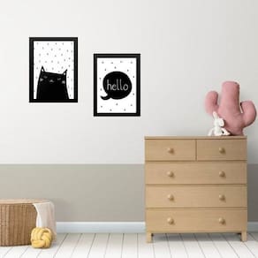 Kit 2 quadros infantis gatinho escandinavo 33x24cm Moldura: madeira branca Informações do produto tire todas as suas dúvidas no descritivo abaixo: decoração para quarto, sala, cozinha, escritório, área gourmet e muito mais. Chega de paredes vazias medidas - cada peça tem 33x24cm a4 . Material do papel - papel fotográfico brilhante de altíssima resolução acabamento - todos os quadros são acompanhados de uma película de acetato para proteção da imagem. - os quadros são embalados de forma segura com plástico bolha com camada dupla de acordo com o tamanho dos quadros. Garantia - garantia de 3 meses. Meu quadro chegou. Como posso fixá-lo Você precisa apenas de um martelo e um prego, pois os quadros já vão acompanhados de penduradores. Esta é a forma mais indicada. Caso prefira, você pode utilizar uma fita dupla face neste caso, sugerimos de alta qualidade para evitar que descole e seu quadro caia . Como posso limpar meu quadro A limpeza é feita como um móvel comum da sua casa. Apenas um pano seco ou espanador são suficientes para tal