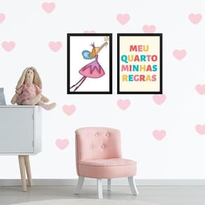 Kit 2 quadros infantis meu quarto minhas regras 24x18cm - com vidro Moldura: madeira branca Informações do produto tire todas as suas dúvidas no descritivo abaixo: decoração para quarto, sala, cozinha, escritório, área gourmet e muito mais. Chega de paredes vazias medidas - cada peça tem 24x18cm a5 . Material do papel - papel fotográfico brilhante de altíssima resolução acabamento - todos os quadros são acompanhados de vidro para proteção da imagem. - moldura em madeira maciça na cor preta ou branca conforme produto escolhido e pendurador . - os quadros são embalados de forma segura com plástico bolha com camada dupla de acordo com o tamanho dos quadros. Garantia - garantia de 3 meses. Meu quadro chegou. Como posso fixá-lo Você precisa apenas de um martelo e um prego, pois os quadros já vão acompanhados de penduradores. Esta é a forma mais indicada. Como posso limpar meu quadro A limpeza é feita como um móvel comum da sua casa. Apenas um pano seco ou espanador são suficientes para tal