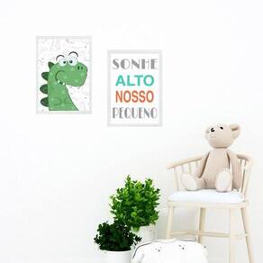 Kit 2 quadros infantis sonhe alto - dinossauro 45x34cm Moldura: madeira branca Informações do produto tire todas as suas dúvidas no descritivo abaixo: decoração para quarto, sala, cozinha, escritório, área gourmet e muito mais. Chega de paredes vazias. Medidas - cada peça tem 45x34cm a3 . Material do papel - papel fotográfico brilhante de altíssima resolução acabamento - todos os quadros são acompanhados de uma película de acetato para proteção da imagem. - os quadros são embalados de forma segura com plástico bolha com camada dupla de acordo com o tamanho dos quadros. Garantia - garantia de 3 meses. Meu quadro chegou. Como posso fixá-lo Você precisa apenas de um martelo e um prego, pois os quadros já vão acompanhados de penduradores. Esta é a forma mais indicada. Caso prefira, você pode utilizar uma fita dupla face neste caso, sugerimos de alta qualidade para evitar que descole e seu quadro caia . Como posso limpar meu quadro A limpeza é feita como um móvel comum da sua casa. Apenas um pano seco ou espanador são suficientes para tal