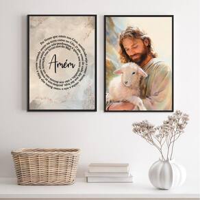 Kit 2 quadros jesus com cordeiro - oração 24x18cm - com vidro Moldura: madeira branca Informações do produto tire todas as suas dúvidas no descritivo abaixo: decoração para quarto, sala, cozinha, escritório, área gourmet e muito mais. Chega de paredes vazias medidas - cada peça tem 24x18cm a5 . Material do papel - papel fotográfico brilhante de altíssima resolução acabamento - todos os quadros são acompanhados de vidro para proteção da imagem. - moldura em madeira maciça na cor preta ou branca conforme produto escolhido e pendurador . - os quadros são embalados de forma segura com plástico bolha com camada dupla de acordo com o tamanho dos quadros. Garantia - garantia de 3 meses. Meu quadro chegou. Como posso fixá-lo Você precisa apenas de um martelo e um prego, pois os quadros já vão acompanhados de penduradores. Esta é a forma mais indicada. Como posso limpar meu quadro A limpeza é feita como um móvel comum da sua casa. Apenas um pano seco ou espanador são suficientes para tal