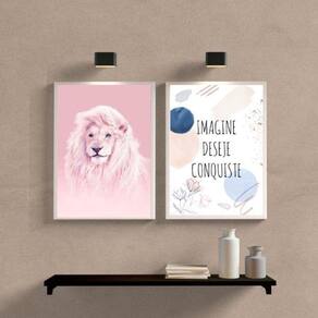 Kit 2 Quadros Leão Rosa Imagine Deseje Conquiste 33X24Cm