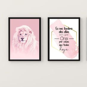 O Kit 2 Quadros Leão Rosa Dias Em Que Orei 33X24Cm é perfeito para decorar qualquer ambiente da sua casa. Com moldura de madeira preta, esse kit traz uma atmosfera única e especial para o seu quarto, sala, cozinha, escritório, área gourmet e muito mais.