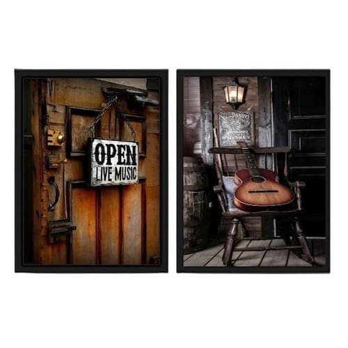Kit 2 Quadros Live Music Violão Vintage 45X34Cm Vidro Preta