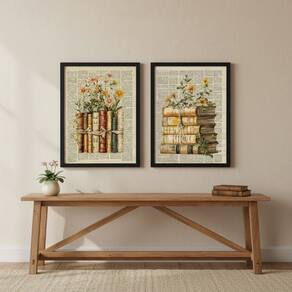 Kit 2 Quadros Livros Com Flores Vintage 45x34cm Mold Preta Vidro