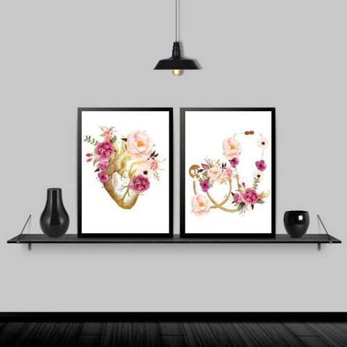 Kit 2 quadros coração e estetoscópio floral 33x24cm