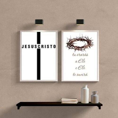 Kit 2 quadros minimalistas evangélicos- jesus cristo 33x24cm - com vidro Moldura: madeira preta Informações do produto tire todas as suas dúvidas no descritivo abaixo: decoração para quarto, sala, cozinha, escritório, área gourmet e muito mais. Chega de paredes vazias medidas - cada peça tem 33x24cm a4 . Material do papel - papel fotográfico brilhante de altíssima resolução acabamento - todos os quadros são acompanhados de vidro para proteção da imagem. - moldura em madeira maciça na cor preta ou branca conforme produto escolhido e pendurador . - os quadros são embalados de forma segura com plástico bolha com camada dupla de acordo com o tamanho dos quadros. Garantia - garantia de 3 meses. Meu quadro chegou. Como posso fixá-lo Você precisa apenas de um martelo e um prego, pois os quadros já vão acompanhados de penduradores. Esta é a forma mais indicada. Como posso limpar meu quadro A limpeza é feita como um móvel comum da sua casa. Apenas um pano seco ou espanador são suficientes para tal Ean: 7895799842145